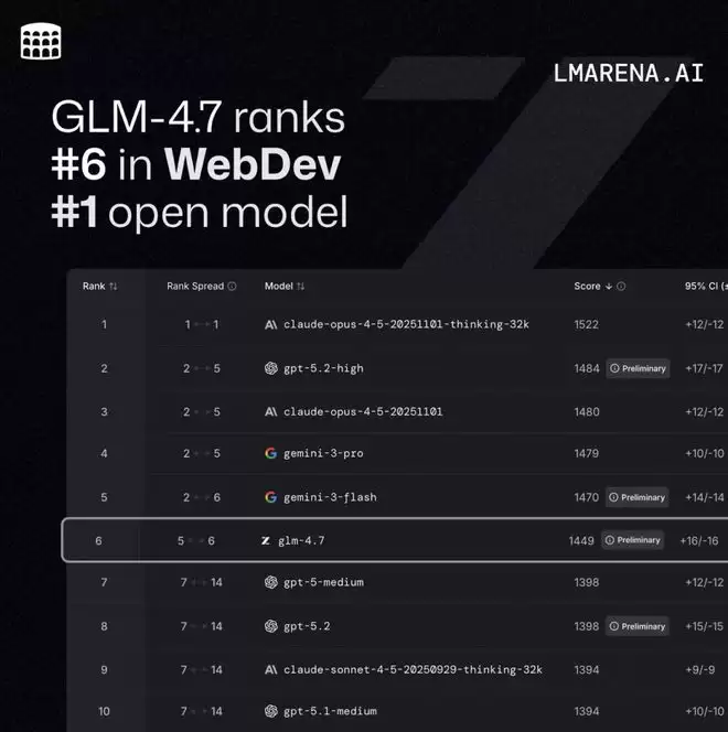 在全球百万用户参与盲测的权威编码评估系统Code Arena中,GLM-4.7位列全球开源第一、国产第一,超过GPT-5.2。