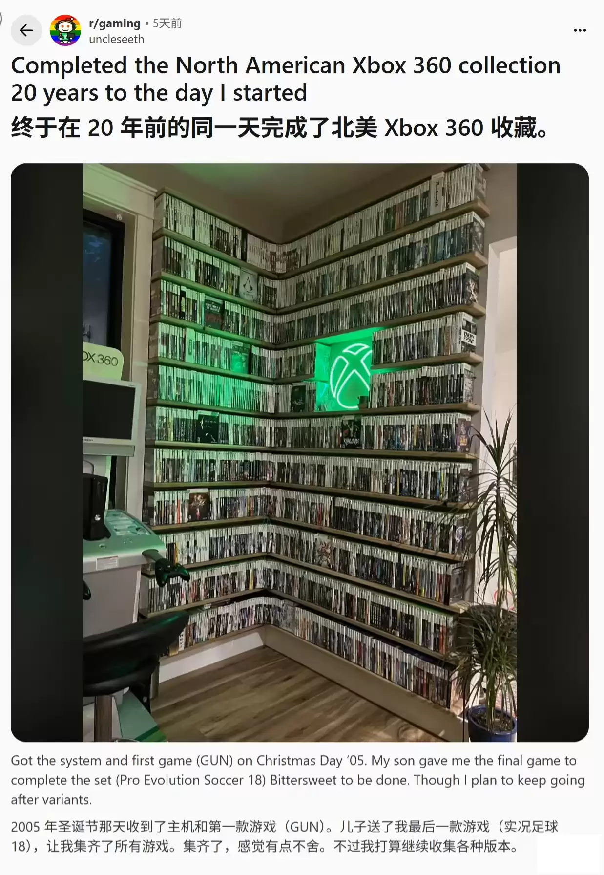 谈及收藏的初衷,uncleseeth坦言最初是被Xbox 360开创的“成就系统”深深吸引。为了争夺更高的玩家分数,他和朋友们展开了一场激烈的“刷分”竞赛,这也让他在组建家庭前就已积累了约700款游戏。