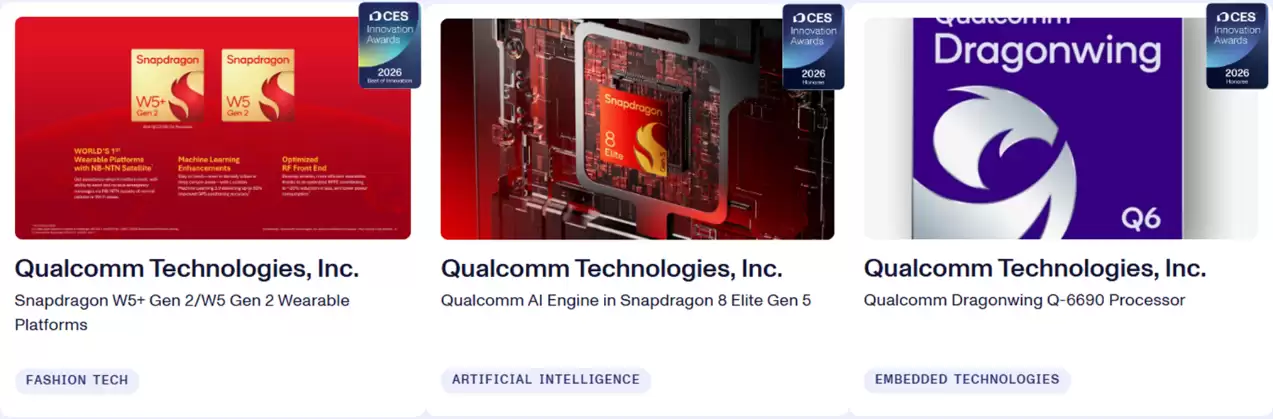 高通公司旗下的第二代骁龙W5+及W5可穿戴平台,荣获CES最佳创新奖。这一奖项被视为CES年度创新成果中的最高级别认可之一。此外,第五代骁龙8至臻版搭载的高通AI引擎,以及高通跃龙Q-6690处理器,也分别在AI和嵌入式技术类别中斩获创新奖。
