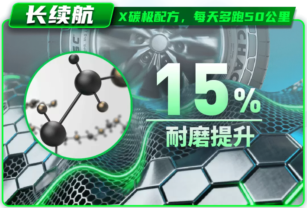 在耐磨性和耐久性方面,EV505同样表现出色。其采用的X碳极+超级VAN卡专用配方,匹配180mm超宽胎面和9.5mm花纹深度,使轮胎的耐磨性提升了15%,耐疲劳和抗腐蚀性能提升了50%以上。独特的冠部抗刺穿和胎侧防剐蹭设计,大大降低了轮胎的故障率,有效延长了轮胎的使用寿命。