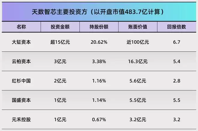 从投资回报的角度看,大钲无疑是天数智芯上市的最大赢家。按照开盘市值483.7亿计算,大钲所持20.62%(IPO后)股份价值接近100亿元。相较于累计15亿元的投资成本,预期回报倍数约6.7倍。