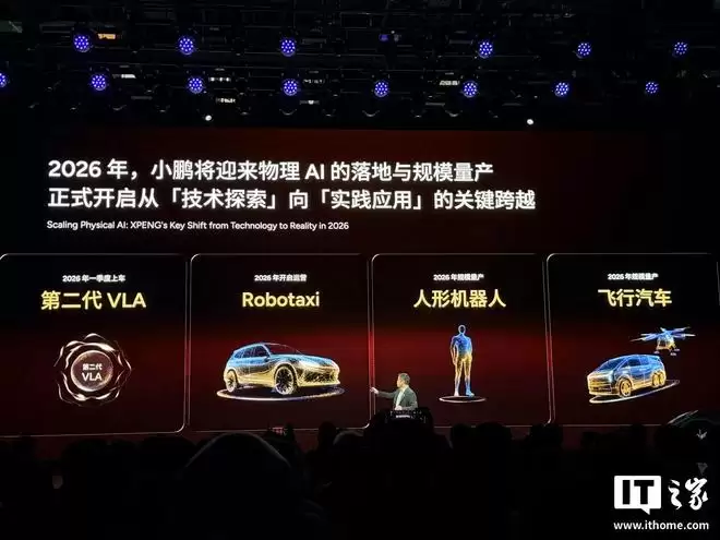 据IT之家从发布会现场了解,何小鹏详细阐述了小鹏汽车在2026年的具体规划,其中包括第二代VLA平台车型在第一季度交付、Robotaxi业务启动运营、人形机器人实现规模化生产,以及飞行汽车进入量产阶段。