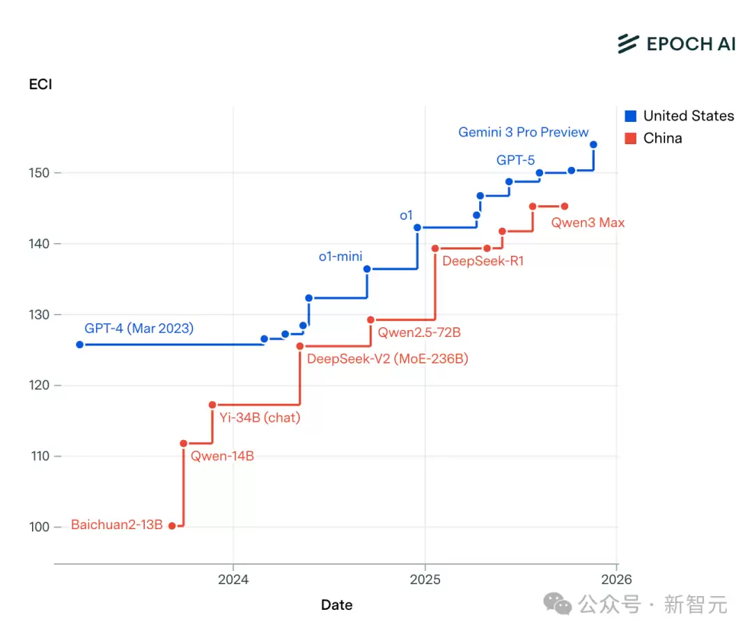 Epoch AI的最新图表,其衡量标准依旧是综合性能指数ECI。该指数综合考量了语言理解与生成、推理与问题分解能力以及多任务泛化表现,其评估结果已通过公开模型测试与专家校准。