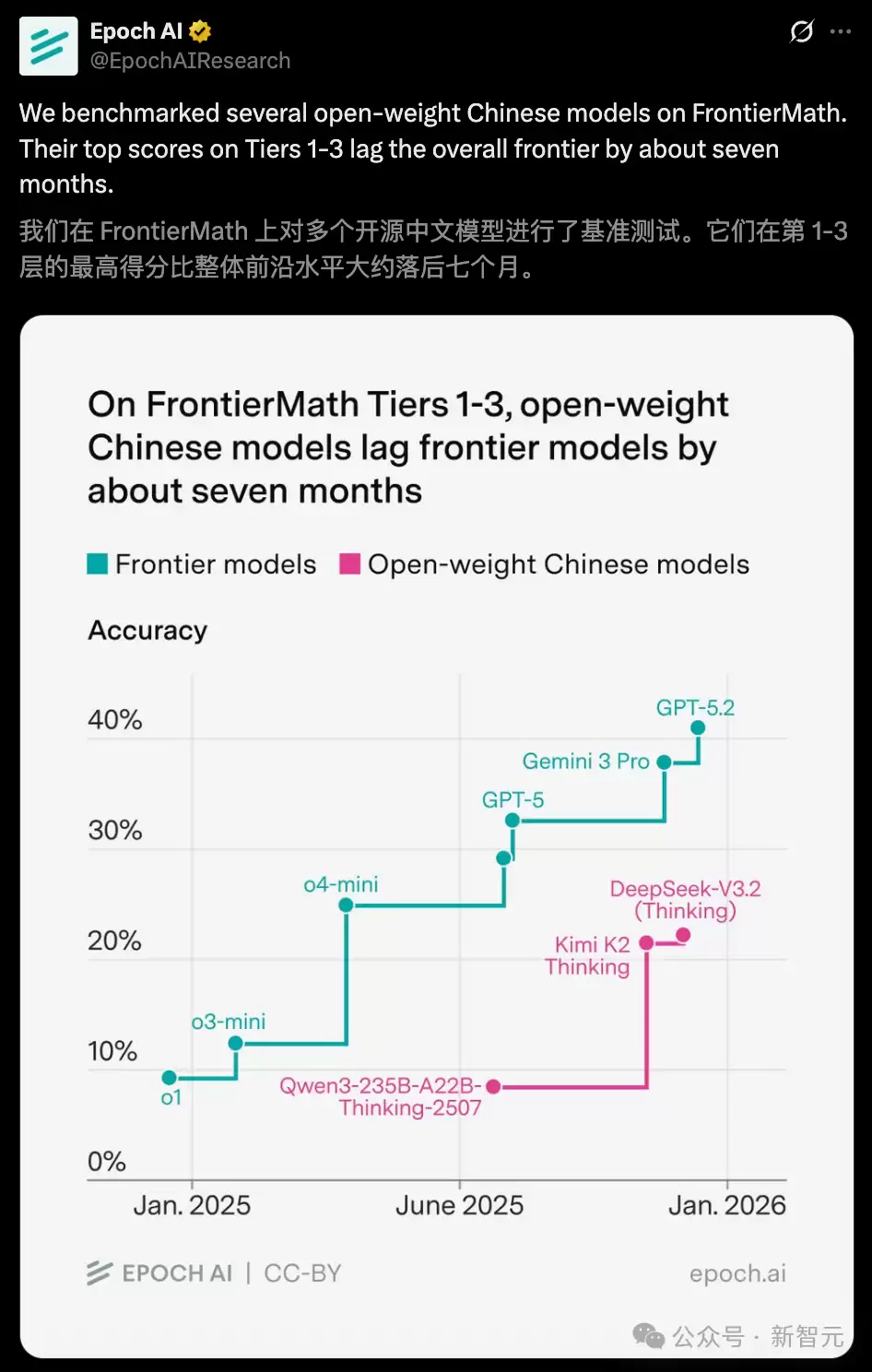 不仅如此,在前沿数学基准FrontierMath的测试中,也印证了中美AI的实力差异,时间差同样在7个月左右。
