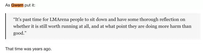 LMArena的人是时候坐下来好好反思一下,他们是否还值得继续运营,在什么时候他们造成的危害已经大于收益。