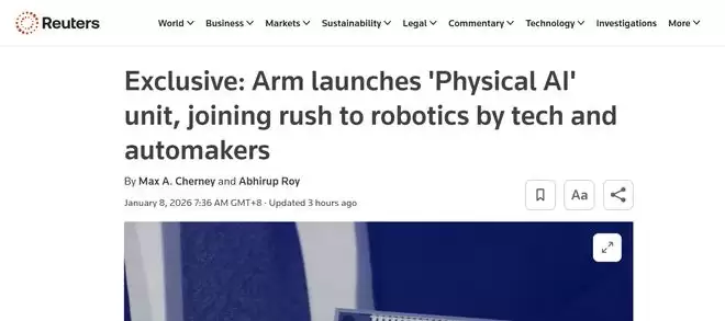 【环球网科技综合报道】1月8日消息,据路透社报道,在2026年国际消费电子展(CES 2026)期间,全球领先的半导体知识产权提供商Arm公司高管确认,公司已完成内部运营架构优化调整,正式设立物理AI业务线,将汽车与机器人相关业务进行整合。该业务线与云与AI(数据中心)、边缘计算(涵盖智能手机、平板电脑、PC等终端)共同构成公司三大核心业务板块。