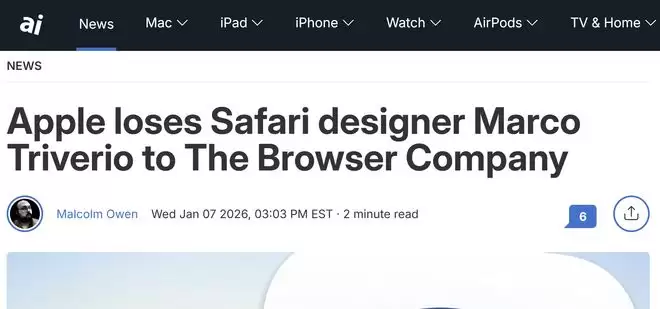 【环球网科技综合报道】1月8日消息,据 AppleInsider 报道,The Browser Company 首席执行官乔希·米勒(Josh Miller)近日在社交平台 X 及领英(LinkedIn)正式宣布,苹果 Safari 浏览器前任首席设计师马尔科·特里维里奥(Marco Triverio)已加盟该公司。