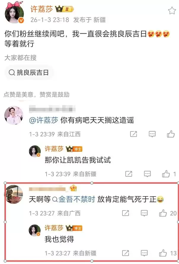 几日前,由于赵晴粉丝的不断骚扰,许荔莎还曾放出豪言,会挑个“良辰吉日”继续放瓜。