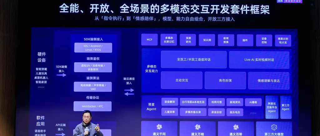 智东西1月8日报道,在今天的阿里云通义智能硬件展上,阿里云发布了全新的多模态交互开发套件。这套工具集成了千问、万相、百聆三大通义基础大模型,并预置了十余款涵盖生活休闲、工作效率等领域的智能体和MCP工具。