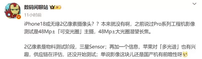 不过详细说iPhone 21之前还是和大家先来聊一聊iPhone 18的消息,因为最近关于iPhone 18将首发2亿像素的传闻满天飞。