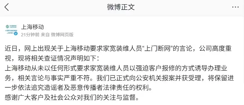 上海移动从未以任何形式要求家宽装维人员以强迫客户报修的方式诱导办理业务,相关言论与事实严重不符。我们已正式向公安机关报案并获受理,将保留进一步依法追究造谣者及恶意传播者法律责任的权利。