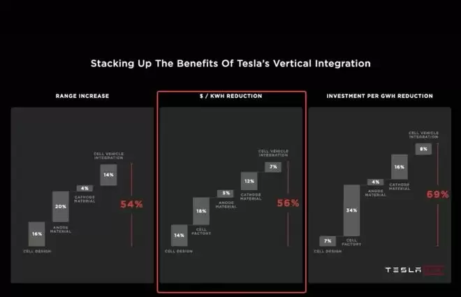 但仅仅是形状变化,很难达到马斯克单位电池成本降低56%的目标。按照特斯拉的规划,这个数字14%靠设计、18%靠生产、17%靠正负极材料(5%负极、12%正极)、7%靠电池与车身集成技术。