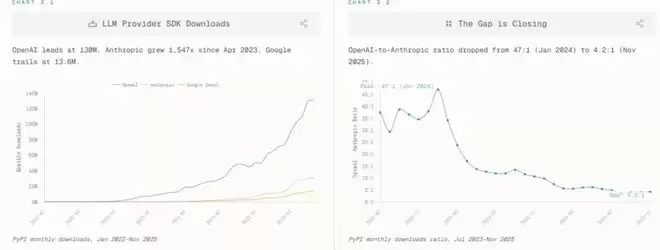 虽然起步较晚且基数较小,但自2024年下半年开始,其下载量呈指数级爆发,到2025年11月已达到4300万次,实现了自2024年4月以来1547倍的惊人增长,Open AI和Anthropic的比值已从47:1缩至4.2:1——开发者正在用脚投票,向更开放、更可控、更可编程的接口迁移。