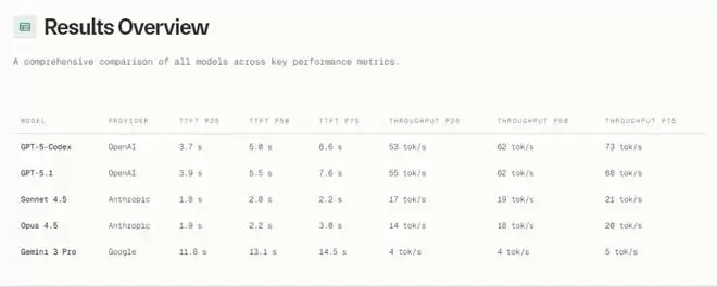 通过该表,可看出Claude Sonnet 4.5与Opus 4.5只需要等待不到2.5秒,就会返回第一个token,显著优于GPT-5系(>5秒)。而在交互式编程中,2秒是「心流」与「分心」的临界阈值。