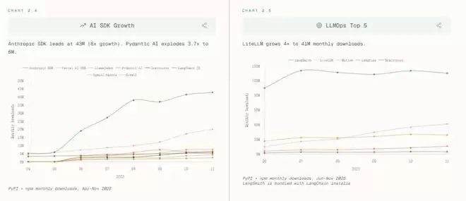 LLMOps层,LiteLLM增长4倍至4100万下载,LangSmith借LangChain生态捆绑上位。这印证一个趋势,即模型调度、监控、降级已从「可选项」变为「基建标配」。