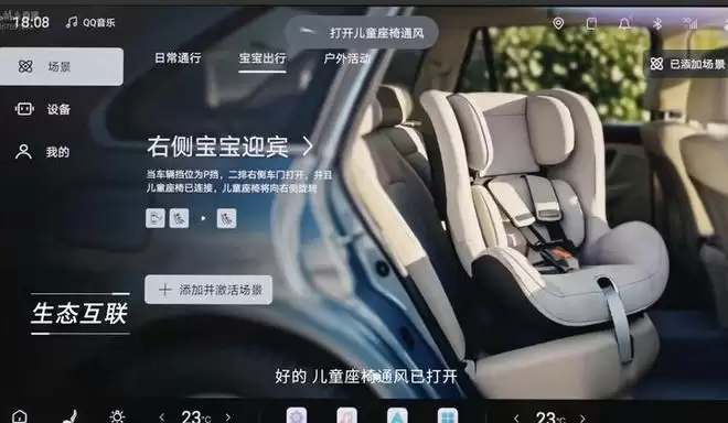 路天表示,为了应对春节长途塞车的场景,车机系统强化了娱乐属性,支持无麦 K 歌、成语接龙等互动功能,甚至联动了倍轻松推出了智能眼罩和颈部按摩仪。针对奶爸奶妈群体,比亚迪还把之前在高端车型上展示过的智能儿童安全座椅搬进了秦 L,支持拉开车门自动转向迎宾,并能通过大屏直接调节座椅的角度与通风。