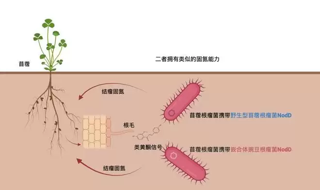 进一步研究发现,将苜蓿根瘤菌NodD蛋白中负责信号识别激活的关键氨基酸,移植到豌豆根瘤菌NodD上后,包含改造的豌豆根瘤菌NodD的苜蓿根瘤菌竟能成功被苜蓿发出的类黄酮信号所触发,并展现出与野生型苜蓿根瘤菌相似的固氮能力。