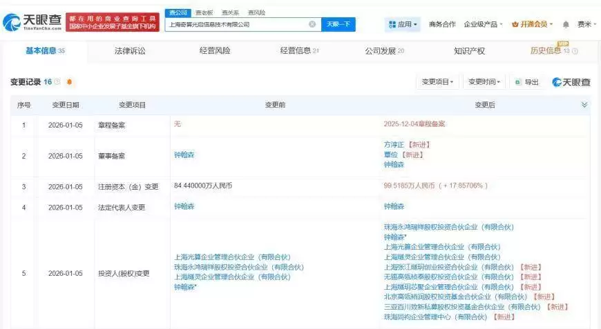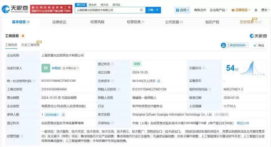 此次工商变更中,公司部分主要人员也同步调整,反映出战略升级与组织优化的同步推进。作为一家成立仅数月的新兴企业,上海奇算光启已吸引多家头部投资机构布局,显示出资本市场对光计算赛道的高度关注。随着技术迭代与生态完善,光计算芯片或将在人工智能基础设施领域扮演关键角色。