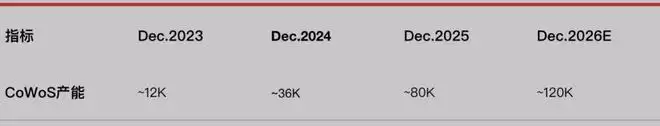 从我们掌握的情况来看,过去三年,台积电CoWoS产能一路从单月12K晶圆,逐步爬升至2025年底的80K/月,2026年年底的预估目标是120K/月左右。