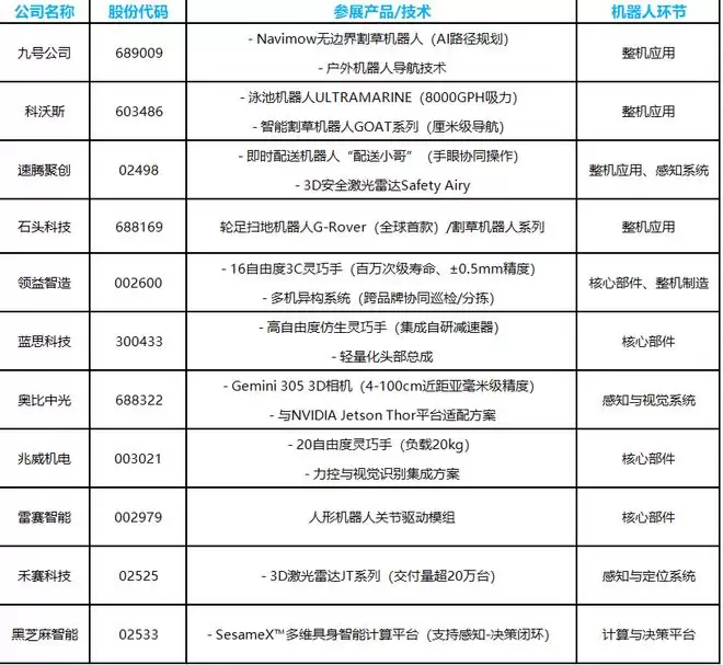 除上述企业之外,据智通财经APP不完全统计,仍有超10家与机器人产业相关的上市公司参与此次展会,该等企业不仅覆盖了整机应用,还囊括了关节模组、激光雷达、灵巧手、3D视觉、计算平台等多个产业环节。