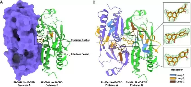 这项最新研究发现,豌豆根瘤菌NodD蛋白的配体结合结构域通过两个蛋白口袋识别橙皮素——一个结合口袋位于NodD蛋白的单体中,一个位于NodD蛋白的二聚界面上,这种结合构象在已知的NodD所在的转录调控因子家族中尚属首次发现。进一步分析表明,NodD的三个关键结构元件,形成识别配体的"结合口袋",能适配橙皮素等黄酮分子,却不能适配像异黄酮和紫檀芪等其他类别的类黄酮化合物。这从结构的角度解释了为什么根瘤菌NodD能够特异性地被类黄酮分子所结合激活。