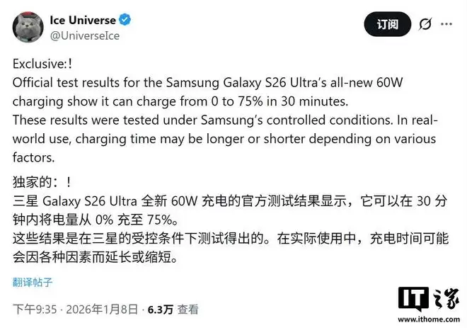 IT之家1月9日快讯,爆料达人@UniverseIce昨日(1月8日)在X平台发布推文透露,配备60W充电器的三星Galaxy S26 Ultra仅需30分钟即可将手机电量从0%充至75%。
