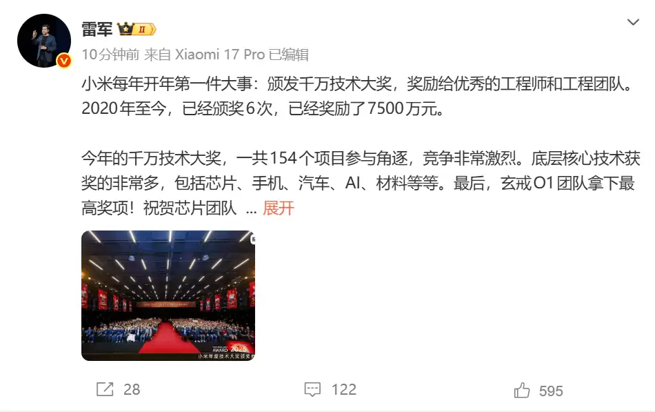 玄戒O1斩获小米千万大奖,雷军:未来5年投入2000亿攻坚底层技术