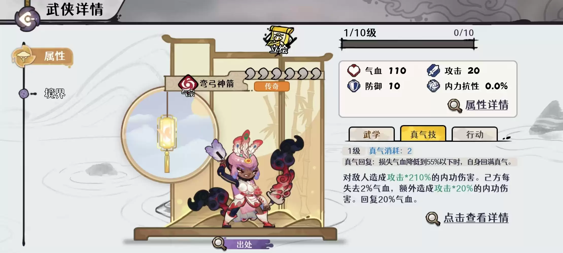 该体系成型的关键在于天山灵童的机制适配性——其集增伤、治疗、复活、减怒于一体,是维持自残循环稳定运转的核心枢纽。输出核心弯弓神箭需达成四命状态:战斗开始时,若自身气血高于75%,则立即扣除20%最大气血,并永久提升10%攻击力;每回合开始时,若气血低于55%,则自动恢复至55%。这一"掉血—增伤—回血"闭环,使伤害随回合数呈指数级叠加。辅助位天山灵童建议至少三命,四命效果更优:当任意己方角色气血降至55%以下时,其下一次普攻或武学伤害提升15%。