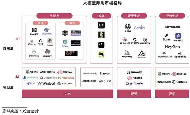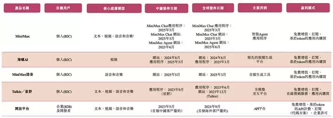 根据灼识咨询的资料,MiniMax在生产力、音频生成、文本、视觉、音频等大模型应用领域均有知名产品。