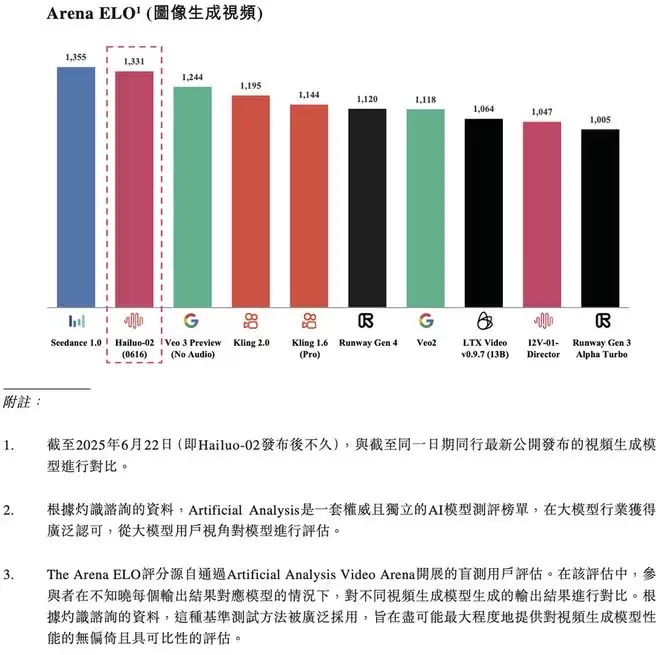 视频生成模型方面,其2024年8月发布的Video-01模型及海螺AI产品已达到当时业界顶尖水平;2025年6月推出的升级版Hailuo-02,在权威的Artificial Analysis视频评测中位列全球第二,累计生成视频超5.9亿个。