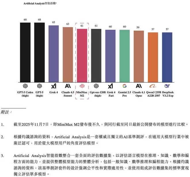 大语言模型方面,2025年10月,该公司发布并开源新一代文本大模型MiniMax M2,发布即在Artificial Analysis位列全球前五、开源第一,也是中国开源大模型首次在该榜单中跻身全球前五。M2在全球模型聚合平台OpenRouter上迅速爬升到国内模型token用量第一,编程场景排名全球token用量第三。