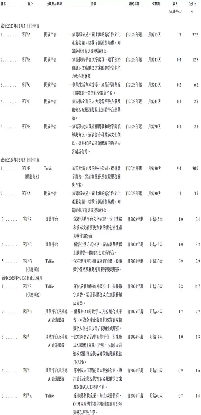 2024年-2025年9月,MiniMax前五大客户贡献收入占比分别为60.5%、44.1%及21.7%。同期,来自最大单一客户的收入分别为130万美元、940万美元和780万美元,分别占相应总收入的37.2%、30.9%和14.7%。