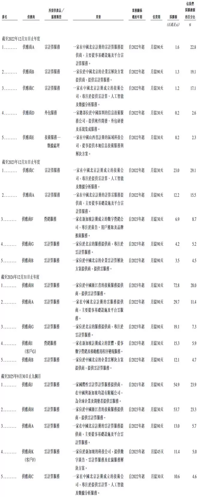在供应商方面,MiniMax主要采购云基础设施服务。2024年-2025年9月,MiniMax向前五大供应商作出的采购额分别为450万美元、4980万美元、1.49亿美元和1.44亿美元,分别占相应采购总额的63.9%、63.0%、57.3%及