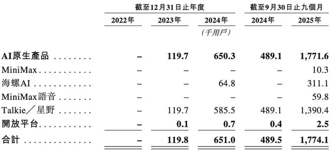 截至2025年9月30日,其AI原生产品累计用户数增至2.12亿以上,平均MAU从2024年的314万增长超6倍至2024年的1911万,并进一步增至2025年1-9月的2764万。
