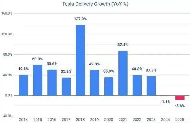 1月2日,特斯拉发布了2025年四季度和全年的汽车交付数据,两项数据均大幅下滑。数据显示,2025年第四季度,特斯拉新车交付量为418227辆,同比减少16%。从2025年全年来看,特斯拉新车交付量为163.6万辆,较2024年同期(178.9万辆)减少约15万辆,同比下降8.6%,这也是特斯拉连续第二年新车销售出现同比缩水。