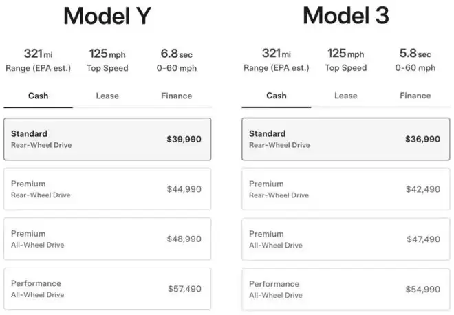 除了外观和内饰之外,新款标准版的Model Y和Model 3性能参数也有下调。其中,廉价版Model Y续航从574公里降至516公里,Model 3标准版EPA标准下续航从584公里降至516公里。同时,0-60英里加速时间也从4.9秒延长至5.8秒。不过,FSD(全自动驾驶)功能仍作为选装配置保留,消费者可支付8000美元进行加装。
