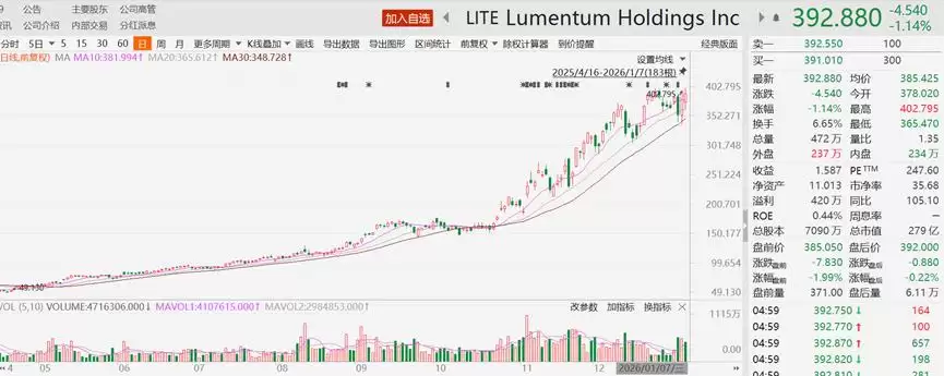 值得一提的是,美股光芯片概念股Lumentum近期股价也创下新高,半年多来累计涨幅已超过280%。