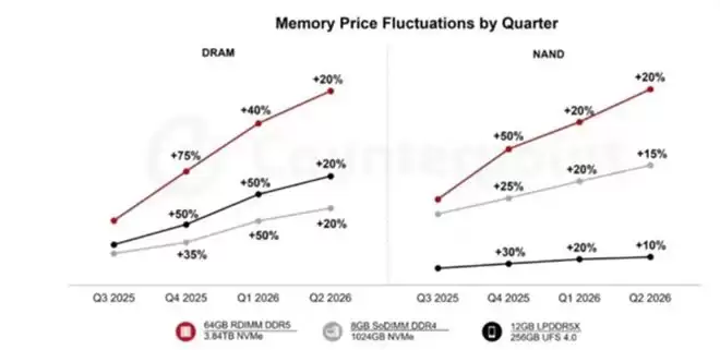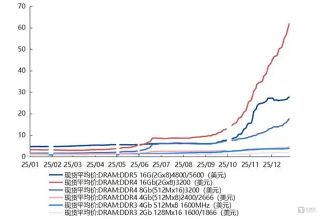 但9月下旬开始,市场开始担忧存储芯片价格上涨对终端需求的抑制作用,尤其对成本敏感的中低端机型可能造成冲击,板块由此进入震荡下行通道。全年,DDR5内存价格累计涨幅超过120%;LPDDR5X手机内存价格翻倍;NAND闪存涨幅突破300%,涨价风暴从供应链上游持续向下传导,不断刷新PC与手机市场的产品定价、配置策略与竞争格局。