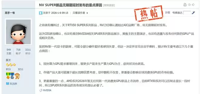据IT之家1月9日消息,论坛版主“高手一号”于昨日(1月8日)在博板堂发帖透露,英伟达已通知合作伙伴将无限期搁置RTX 50 SUPER系列显卡的发布计划,甚至可能彻底取消这条产品线。