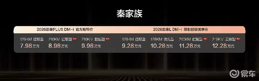 比亚迪近期推出了2026款秦L DM-i与秦PLUS DM-i两款210公里长续航版车型,以“续航升级+价格下探”的双重策略,正在重塑插电混动家轿市场的竞争格局。其中秦PLUS DM-i起售价下探至8.98万元,首次将纯电续航达200公里级别的车型带入了8万元价格区间,这标志着插混车型正式进入了“油电同价”,甚至“电比油低”的全新竞争阶段。