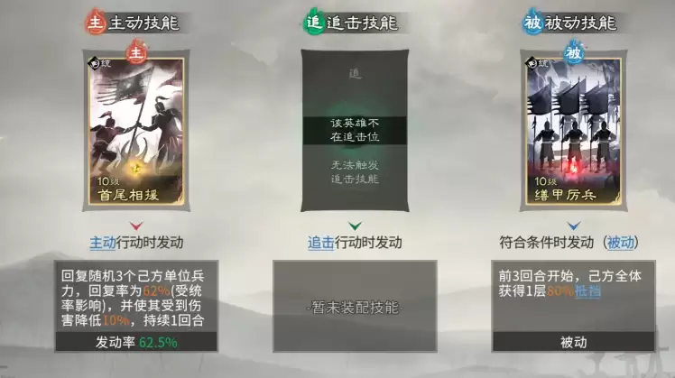贾诩在此体系中并非主控者,而是控制链的最大受益者。当队友成功施加控制效果时,贾诩可对被控单位额外造成58%伤害;若混乱单位对其造成伤害,则可恢复自身兵力;若友军误伤贾诩,还将触发额外减益效果。其技能组合聚焦于精准收割与爆发强化:主动技能必带【兵无常势】,自动锁定敌方兵力最低单位进行打击,加速敌方减员进程;追击技能同样推荐【计谋巧变】,该技能伤害随敌方所受控制状态数量增加而提升,中后期控制叠满后可打出极高瞬时爆发;被动技能延续【兵不厌诈】,确保在控制链持续运转期间稳定提升输出权重。整套阵容的战术支点,正是董卓【挑衅】与诸葛亮【技穷】的双控协同,构筑起对手难以突破的节奏壁垒。