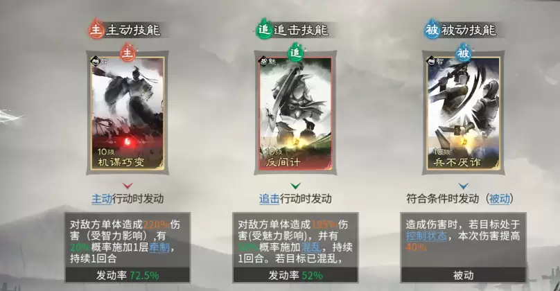 诸葛亮则承担整套控制体系的中枢职能。其天赋【料敌机先】在战斗开始时即提供3层初始层数,我方每次释放技能均可叠加层数,敌方每使用一次技能则消耗1层。该效果不仅造成高达72%的伤害,更会触发智力比拼判定,胜出后可使目标陷入【技穷】状态,持续1回合内无法释放任何主动技能。在技能搭配方面,主动技能推荐【机谋巧变】,兼具高额伤害与概率性牵制效果,能有效抑制敌方追击发动;追击技能选用【反间计】,除稳定输出外,还具备混乱敌方单位的概率,使其攻击目标完全随机;被动技能固定选择【兵不厌诈】,对正处于控制状态的敌人提升40%伤害,完美契合本队控伤一体化的设计思路。