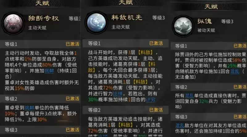 本套阵容的构建核心是“先控场、重节奏”。在兵种配置上,建议前排统一部署藤甲兵,共计三名。利用其高额生存属性吸收大量伤害,为后排输出英雄创造稳定的技能释放空间。英雄站位需要精心规划:贾诩应置于诸葛亮与董卓的追击技能触发范围内;而董卓自身无需占据追击位,此举可确保其技能释放后,由其它角色高频触发追击效果,形成连续的控制反馈链。董卓的定位是开局控制发起者,其天赋技能【独断专权】能在战斗开始瞬间,立即为我方全体降低1点统帅及1%防御,同时对敌方随机4个目标造成80%伤害,并附加1回合挑衅状态——受挑衅单位仅能锁定董卓释放技能,从而大幅削弱敌方整体输出效率与战术灵活性。