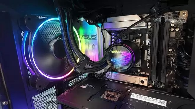 面对旗舰级硬件带来的高功耗与发热挑战,ROG枪神10X配备了420mm的一体式水冷系统,并为CPU设计了独立的散热风道。这种结构有效隔离了热源,确保核心组件在长时间高负载运行下依然保持“冷静”,性能持续在线。在灯效控制上,玩家依然可以通过奥创智控中心,结合神光同步技术,对显卡、风扇、水冷头以及AniMe Holo全息风扇的RGB灯效进行统一管理和联动调节,打造浑然一体、极具视觉冲击力的桌面美学。