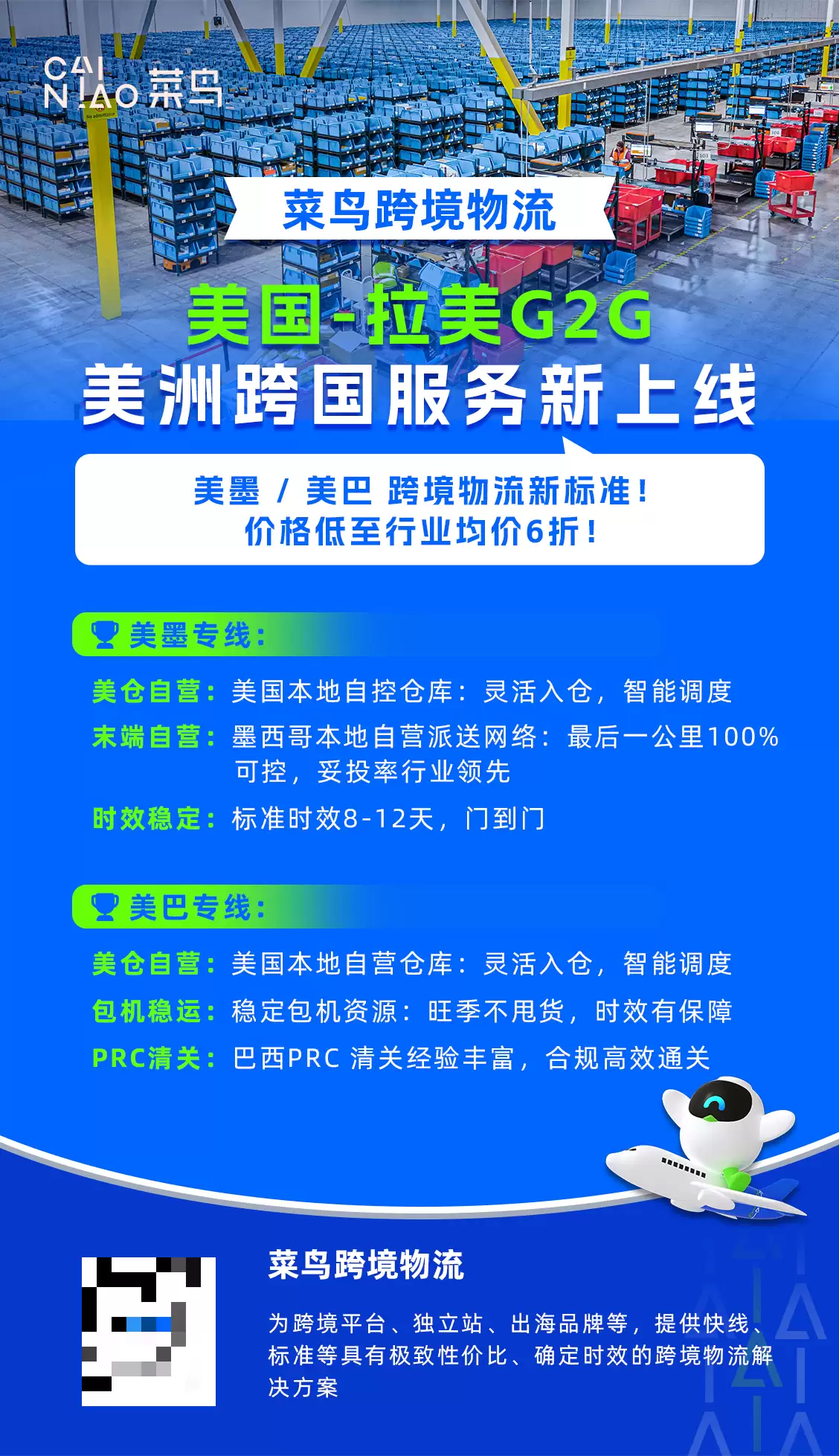 菜鸟美-墨G2G跨境专线以“轻成本、高确定性”为核心产品定位,平均价格比行业均价低40%,其中0-2.5公斤区间价格在市场中有领先优势,相当于“一杯咖啡钱”就能完成美国至墨西哥的跨境配送。同时,该服务依托菜鸟在美国和墨西哥的本地自营网络,利用高效空运最快8日可达墨西哥,以高稳定性为跨境卖家提供更加可控的全链路物流解决方案。