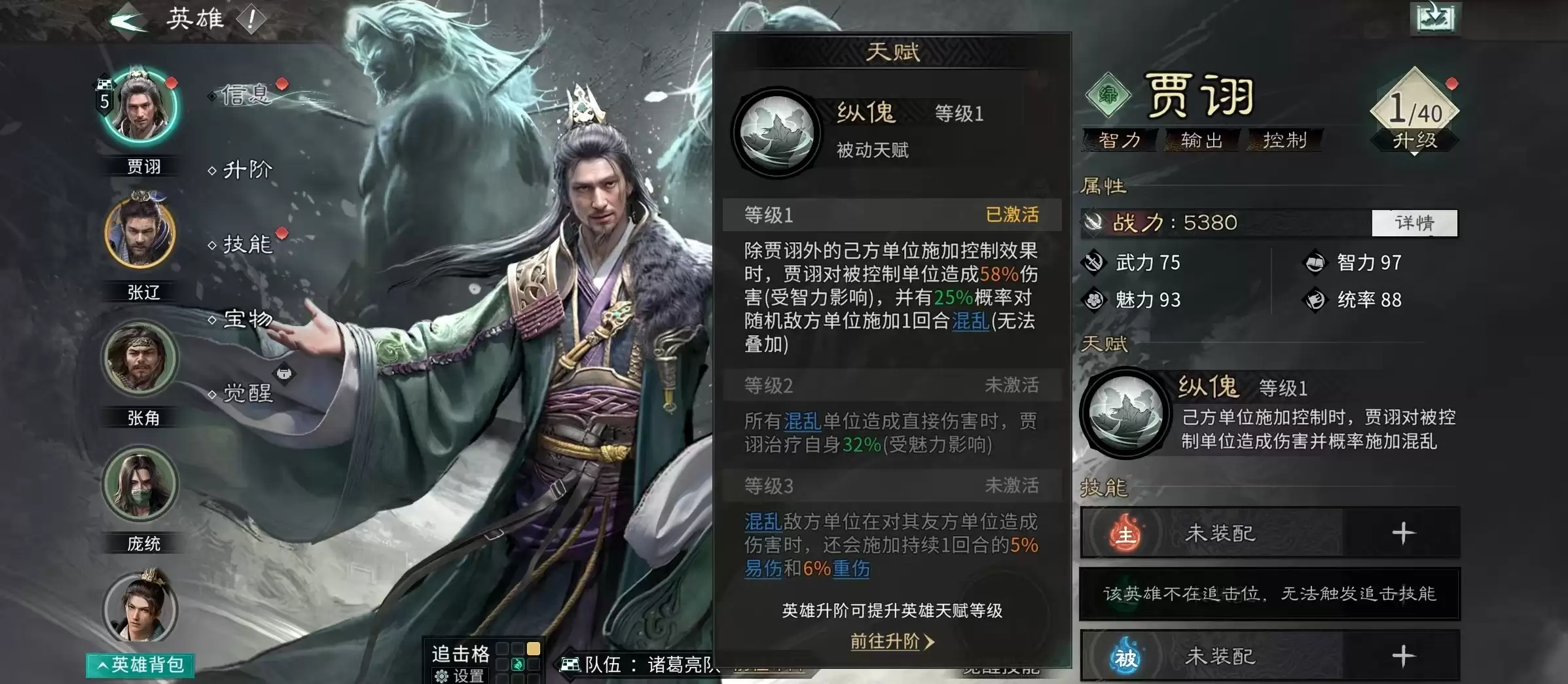 贾诩的基础属性以智力为核心,初始值与成长率均处于全武将梯队前列,确保其在中后期具备持续的输出能力。真正决定其战略价值的则是天赋效果:每当敌方或我方其他单位对目标施加控制状态(如眩晕、挑衅、技穷等),贾诩会立即对该目标发动一次智力伤害,并有概率使一名随机敌方单位陷入混乱。混乱状态下,单位行动目标完全随机,甚至可能攻击友军;更关键的是,所有混乱单位受到直接伤害时,贾诩可恢复自身生命;若混乱单位误伤己方,则目标将额外承受一回合易伤与重伤效果——这使得混乱不仅是干扰手段,更是持续压制与资源转化的关键支点。