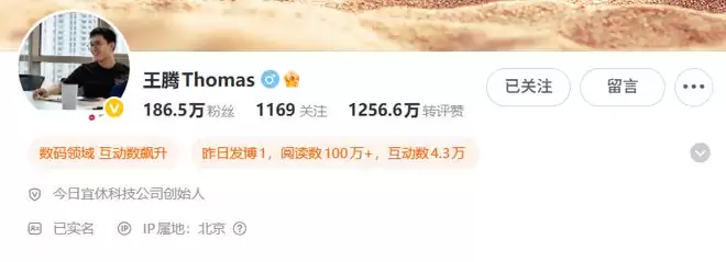 1月8日,王腾正式官宣创业,新公司取名“今日宜休”,主攻睡眠健康和精力管理赛道。到了今天,微博认证也同步更新为“今日宜休科技公司创始人”。