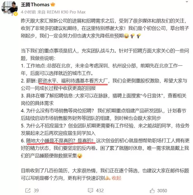 仅隔一天,王腾就火速更新招聘进展,直言已收到几百份简历,正在逐个筛选,并明确承诺“薪资水平、福利待遇基本看齐大厂”,还着重强调了股权激励,看起来是铁了心要从大厂碗里抢人才了。