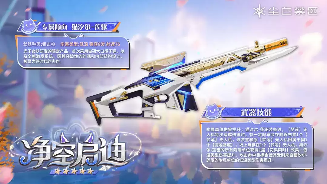 首件登场的武器名为“净空启迪”,其专属适配干员为猫溪尔·莲驱。该武器定位于高协动型狙击装备,核心机制围绕“梦莲”无人机展开:每次无人机造成伤害时,有概率在目标附近生成一枚同类无人机;场上每存在1台“梦莲”无人机,所有附属单位即获得1层“花果同时”效果。此效果可提升低温伤害类型倍率,并使攻击命中时额外触发一次基于武器附属单位的低温属性伤害。