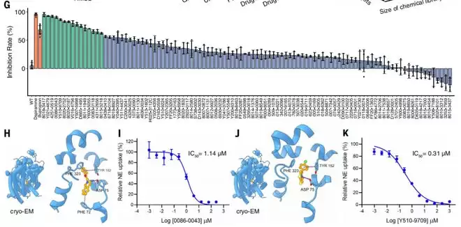 针对另一个抑郁症靶点去甲肾上腺素转运体,它找到了比常用药物安非他酮效果更好的新型抑制剂。研究人员甚至使用冷冻电镜拍下了这些新抑制剂与靶点蛋白紧密结合的清晰照片,证实了 AI 预测的结合模式。